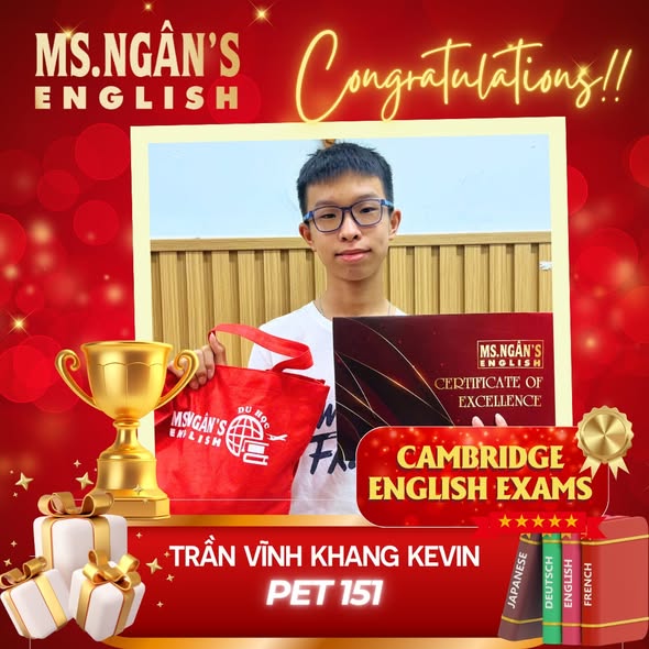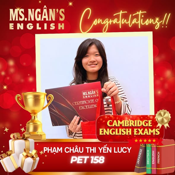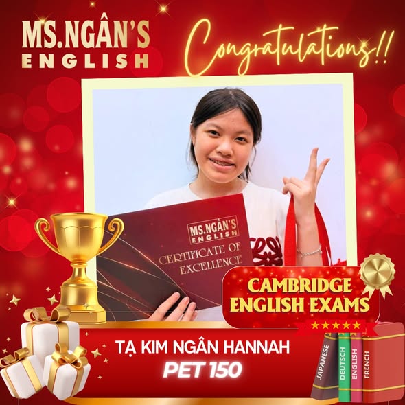 Hệ thống trung tâm Anh ngữ và Du học Ms.Ngân English xin được chia sẻ niềm vui và tự hào khi chứng kiến thành tích xuất sắc của các học viên trong kỳ thi chứng chỉ tiếng Anh Cambridge vừa qua: