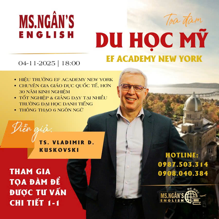 Hệ thống trung tâm Anh ngữ và Du học Ms. Ngân English hân hạnh thông báo buổi tọa đàm đặc biệt cùng Tiến sĩ Vladimir D. Kuskovski – Hiệu trưởng EF Academy New York