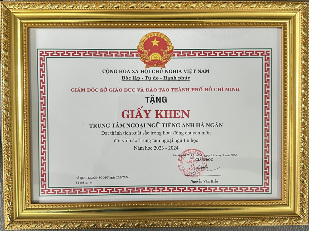 TP.HCM, ngày 28 tháng 9 năm 2024 – Hệ thống Trung tâm Anh ngữ và Du học Ms.Ngân’s English đã vinh dự được Sở Giáo dục và Đào tạo TP.HCM trao tặng giải thưởng “TRUNG TÂM CÓ THÀNH TÍCH XUẤT SẮC TRONG LĨNH VỰC CHUYÊN MÔN” tại Hội nghị tổng kết năm học 2023-2024 và triển khai nhiệm vụ năm học 2024-2025.